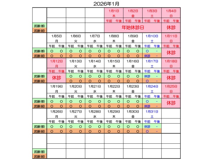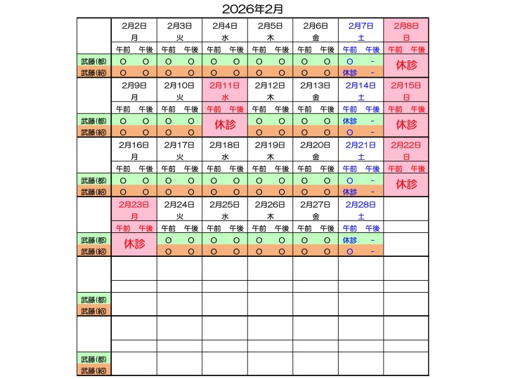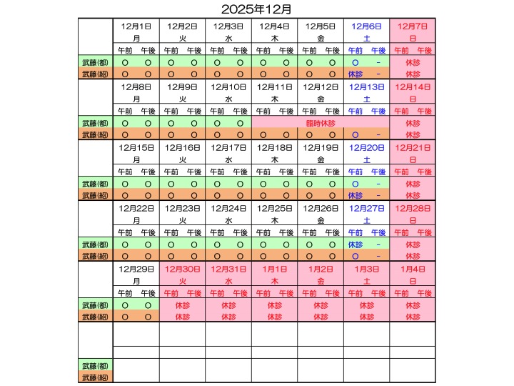 2025年11月13日 / 最終更新日時 : 2025年11月13日 aki 診療日のご案内 2025年11月〜2026年3月の診療予定 12/11~12/13 (木~土) 武藤(都)外来が休診となります。 2025-26年の年末年始休診日は12/30(火)~1/4(日)になります。 コメントを残す コメントをキャンセルメールアドレスが公開されることはありません。 ※ が付いている欄は必須項目ですコメント ※ 名前 ※ メール ※ サイト 上に表示された文字を入力してください。 Δ